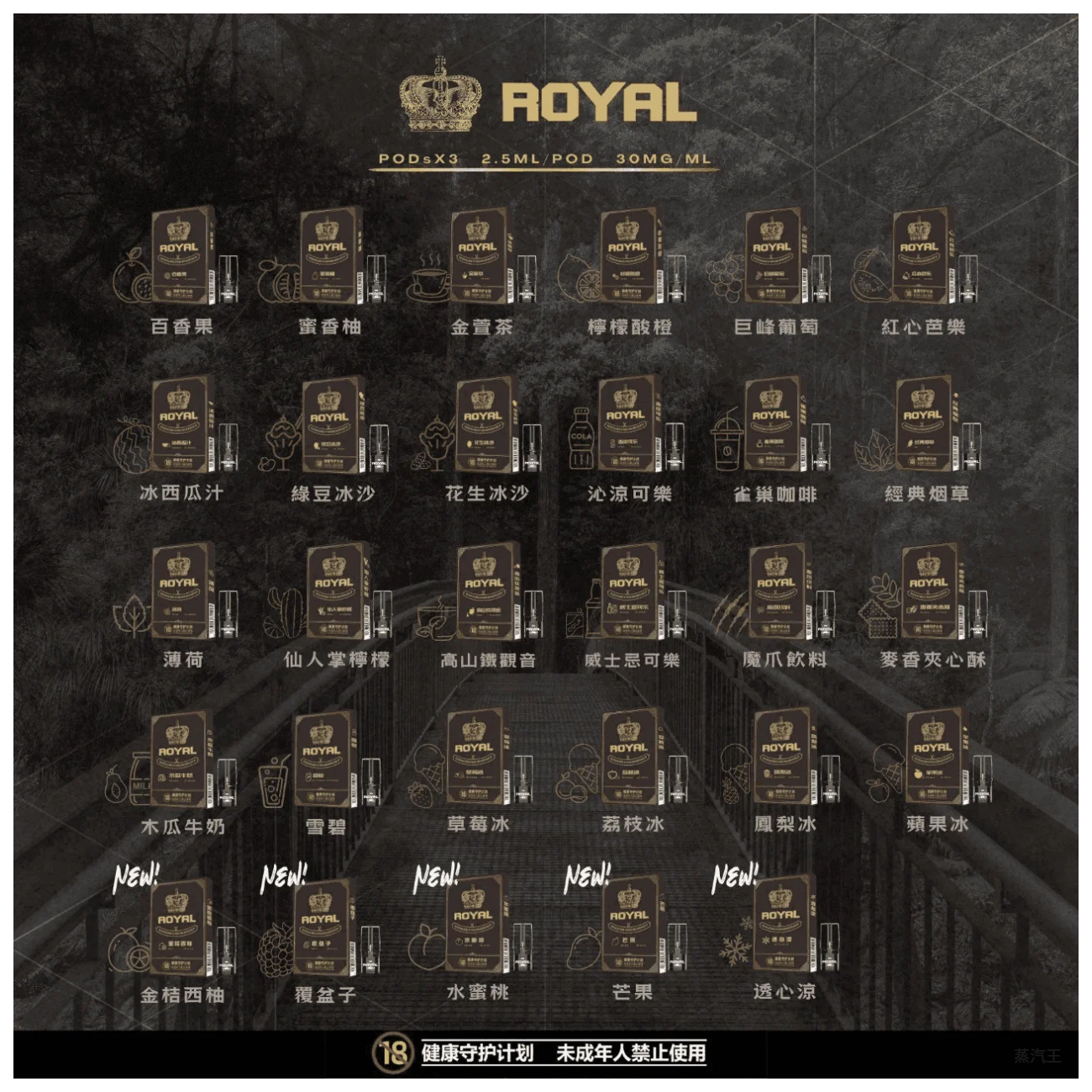| 口味 | 仙人学桲檬, 木瓜牛奶, 紅心芭樂, 草莓冰, 金萱茶, 魔爪歆料, 冰西瓜汁, 檸檬酸橙, 經典菸草, 荔枝冰, 雀巢咖啡, 鳳梨冰, 威士忌可樂, 巨峰葡萄, 沁涼可欒, 百香果, 綠豆冰沙, 花生冰沙, 薄荷, 蘋果冰, 蜜香柚, 雪碧, 高山鐡觀音, 麥香夾心酥 |
